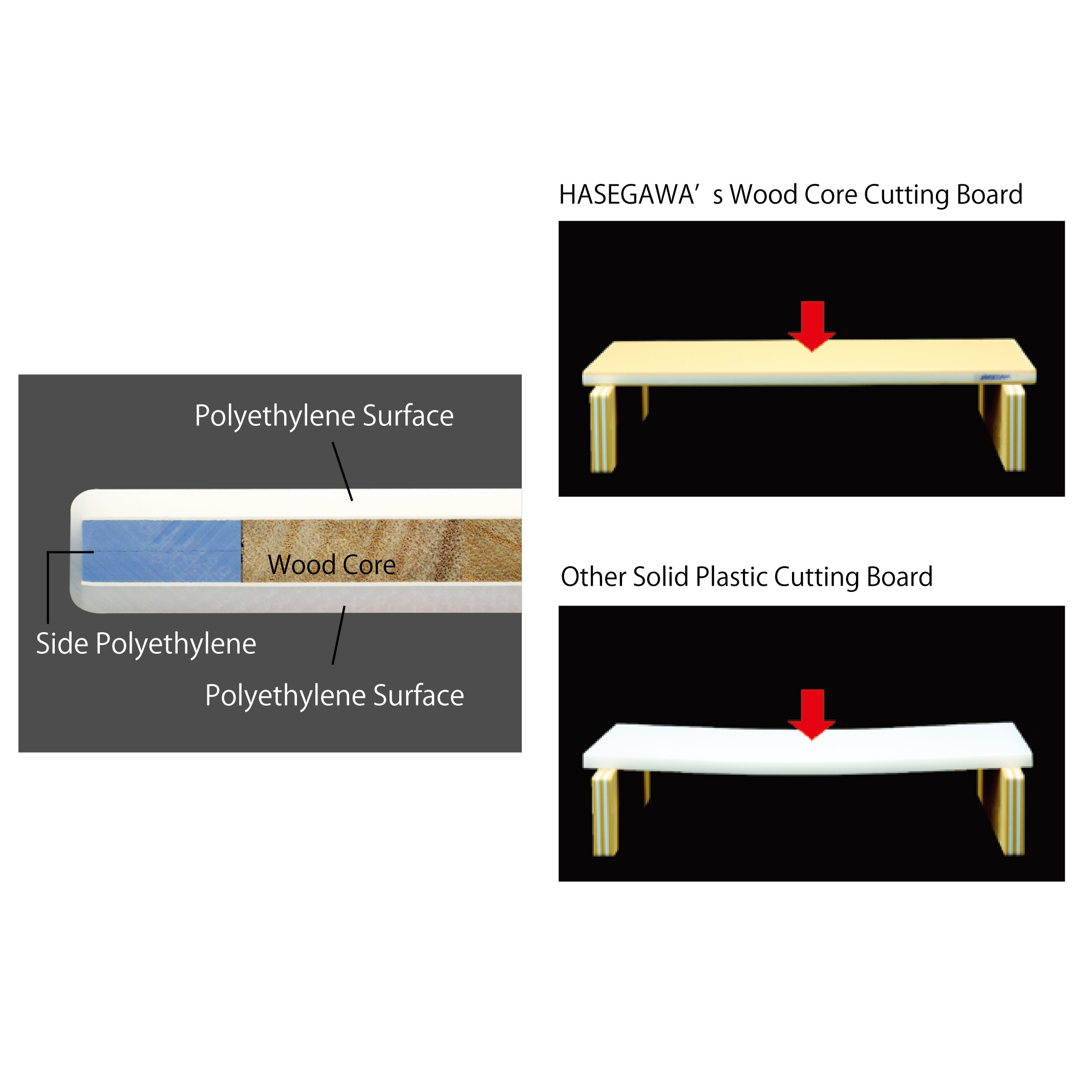 The PE (Polyethylene) Cutting Board - White, takes on your general tasks and will resist staining and deep gouging from rougher work better, compared to our Soft Cutting Board. The wood core structure boosts benefits below.